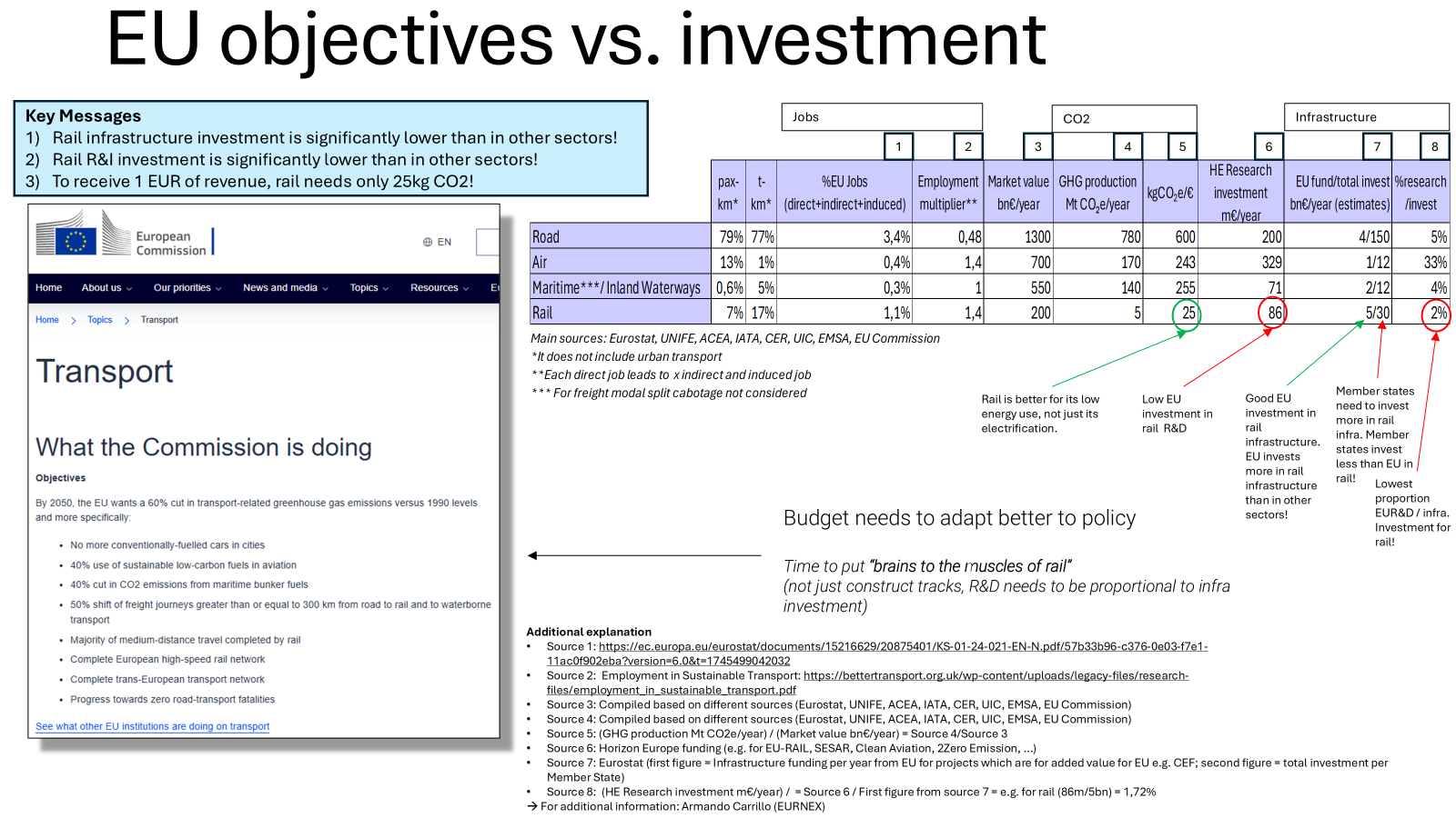 Europe has set ambitious goals for a greener, more sustainable transport future, but when it comes to investment, the numbers tell a different story. While the European Commission calls for major shifts from road and air to rail, funding and research in the rail sector remain dramatically lower than in other modes of transport. Rail is already the cleanest and most energy-efficient way to move people and goods, yet it still receives the smallest share of R&D support and investment.